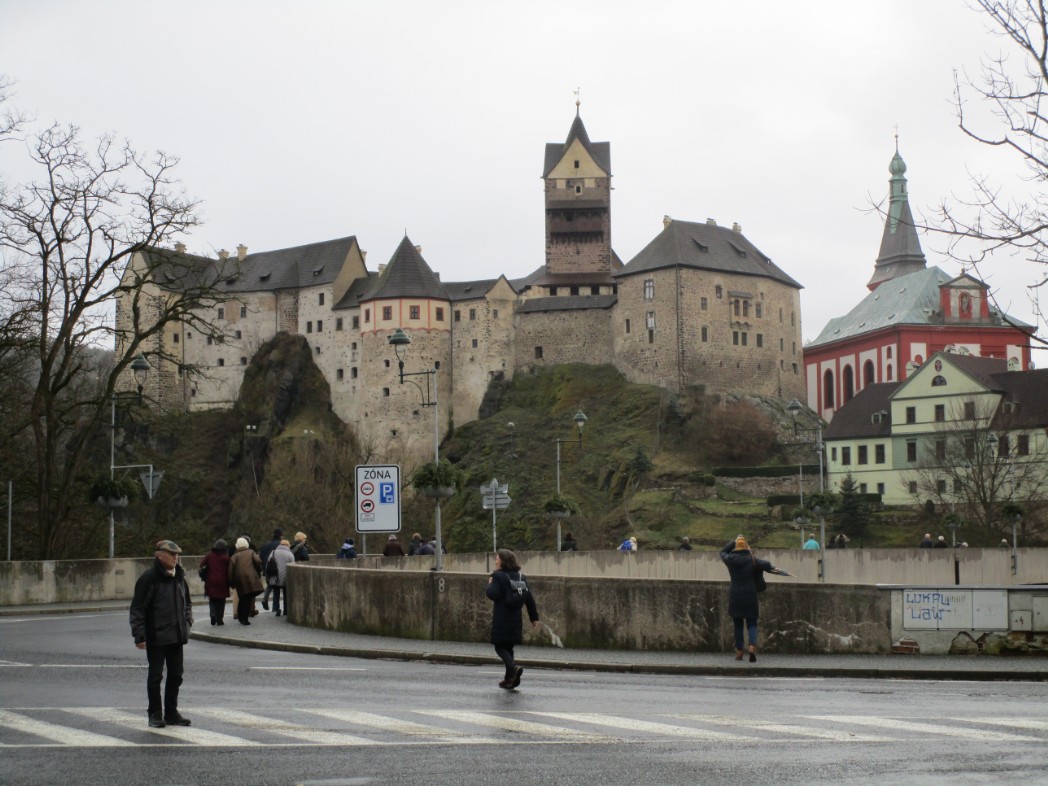 Die Reisegruppe erreichte danach Elbogen, eine Stadt mit rund 3000 Einwohnern. Die gesamte historische Altstadt steht als Denkmalsreservation unter besonderem staatlichen Schutz. Wegen seines Stadtbildes wurde Loket, wie die Stadt heute heißt, auch oft als Böhmisches Rothenburg gerühmt. Die Stadt ist ein traditionelles Ausflugsziel der Kurgäste von Karlsbad. Sie liegt auf einer Höhe von 470 m auf einem Granitrücken, der auf drei Seiten von der Eger umflossen wird. Daher der Name Elbogen (Loket).
