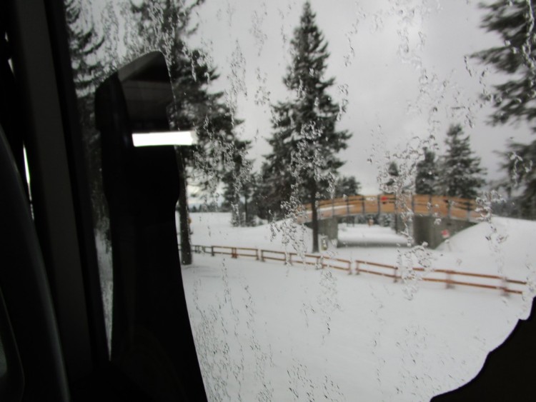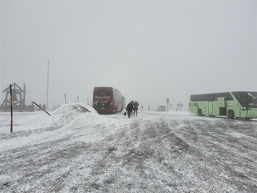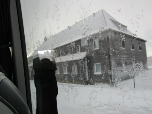 Hier in Gottesgab erreichte die Reisegruppe die Schneegrenze. Ein heftiger Schneesturm setzte ein und im Nu war die Straße zugeweht und die Sicht deutlich eingeschränkt. Die Grenzbaude war schwer zu erkennen. Die Frage Schnee ja oder nein war geklärt. Starke Windböen und kräftiges Schneetreiben auch am Fichtelberg bei Oberwiesenthal. Er ist mit 1225 m der höchste Berg in Sachsen. Gemeinsam mit dem nahe gelegenen Keilberg auf tschechischer Seite bildet er das bedeutendste Wintersportzentrum des Erzgebirges. Am südlichen Bergfuß liegt mit dem Kurort Oberwiesenthal im Pöhlbachtal die höchstgelegene Stadt Deutschlands. Auf dem Gipfel des Fichtelbergs stehen das Fichtelberghaus mit Aussichtsturm und eine Wetterwarte.