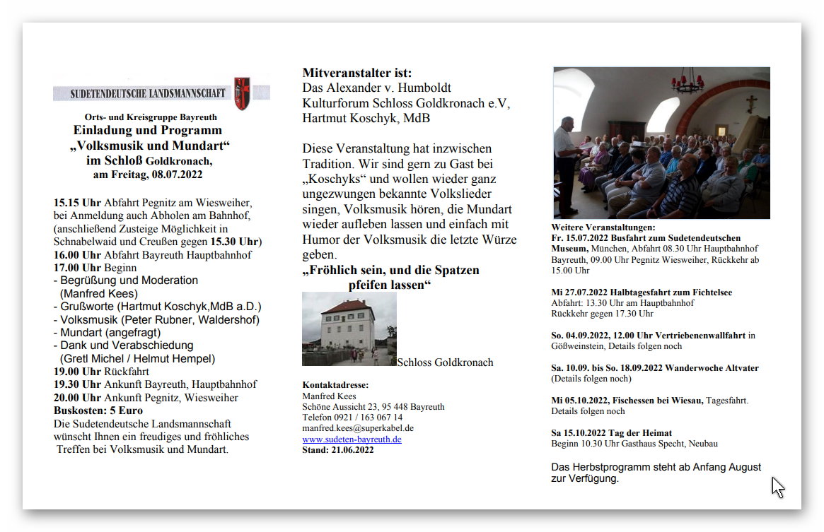 Volksmusik und Mundart am 08. Juli 2022 im Schloss Goldkronach
